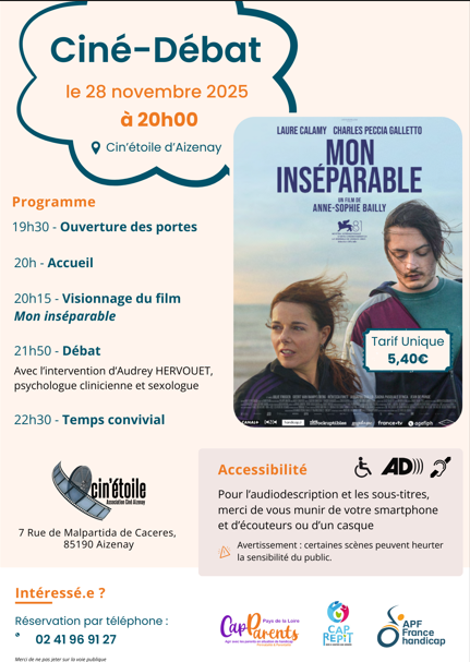 Le dispositif Cap Parents, en partenariat avec Cap’Répit, APF France handicap et le Cin’étoile d’Aizenay, a le plaisir de vous inviter à un Ciné-Débat autour du film "Mon inséparable", d’Anne-Sophie Bailly.